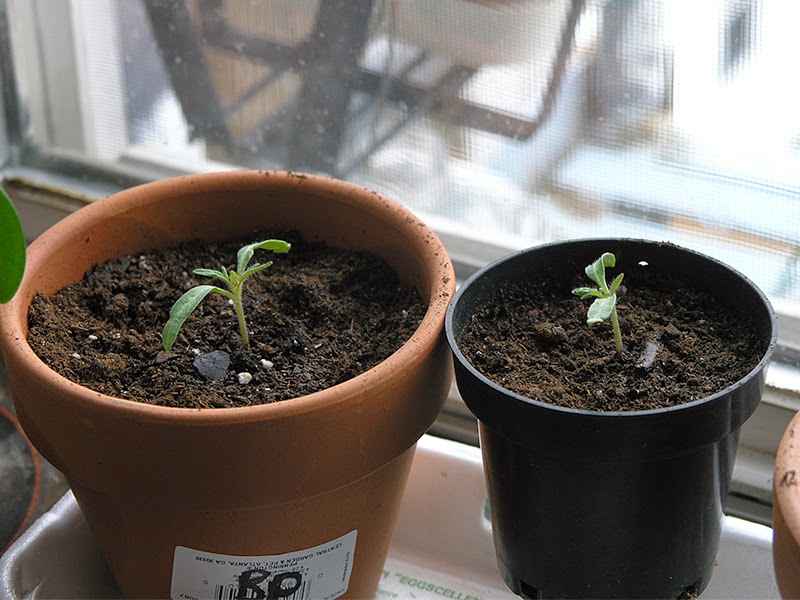 I was somewhat smart and marked up the existing labels with initials, to help identify the varieties. BK - Black Krim, RO - Russian Oxheart, BP - Black Plum, and SG - Sara's Galapagos. Yet, I was also somewhat negligent and managed to leave off a label on the little green pot. I'm pretty sure it's a Black Krim, but there's a chance it may be a Russian Oxheart. However, there might be a way to tell... which I'll point out in my next post.